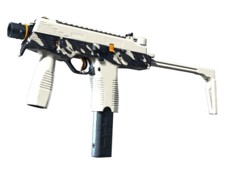 Manufactured in Switzerland, the cutting-edge MP9 SMG is an ergonomic polymer weapon favored by private security firms. This custom paint job features white and blue color blocking and is finished with a matching camouflage. Frigid finality