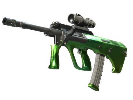 Мощная и точная винтовка с оптическим прицелом AUG компенсирует свою долгую перезарядку низким разбросом пуль и высокой скорострельностью. На основу нанесли хромовое покрытие, а потом окрасили тонким слоем нефритово-зелёной краски, чтобы создать эффект анодированного металла. Лучшее из лучшего