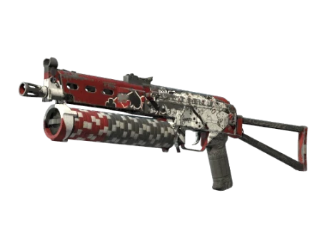 У пистолета-пулемёта «Бизон» низкий урон, который компенсируется уникальным вместительным шнековым магазином с быстрой перезарядкой. На красную основу нанесён рисунок покерных фишек, игральных костей и покерной комбинации флеш-рояль. Ставлю всё