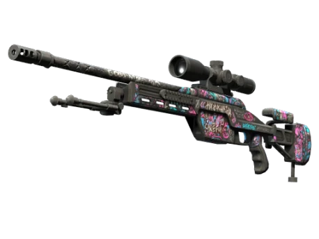 Снайперская винтовка SSG08 со скользящим затвором не наносит много повреждений, однако хорошее соотношение цены и качества делает ее отличным приобретением в первых раундах для перестрелок на дальних дистанциях. Корпус покрыт чёрной основой, на которую нанесены сумасшедшие розовые, голубые и фиолетовые рисунки. Х@@ХХ@Х@Х@ХA!!