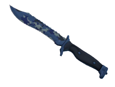 Этот цельный зазубренный нож Боуи создан для выживания в экстремальных условиях. Голубая камуфляжная расцветка была нанесена с помощью аквапечати.